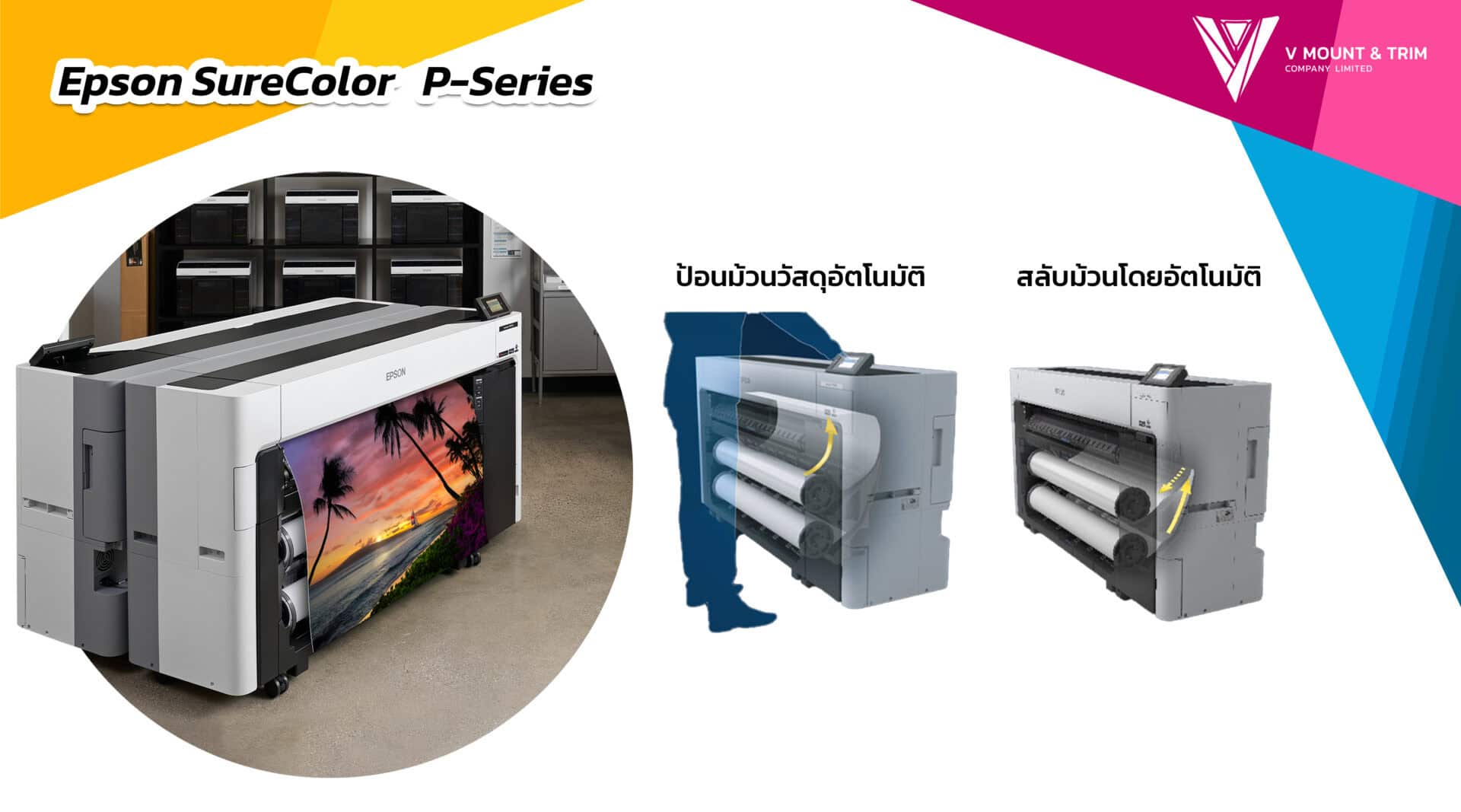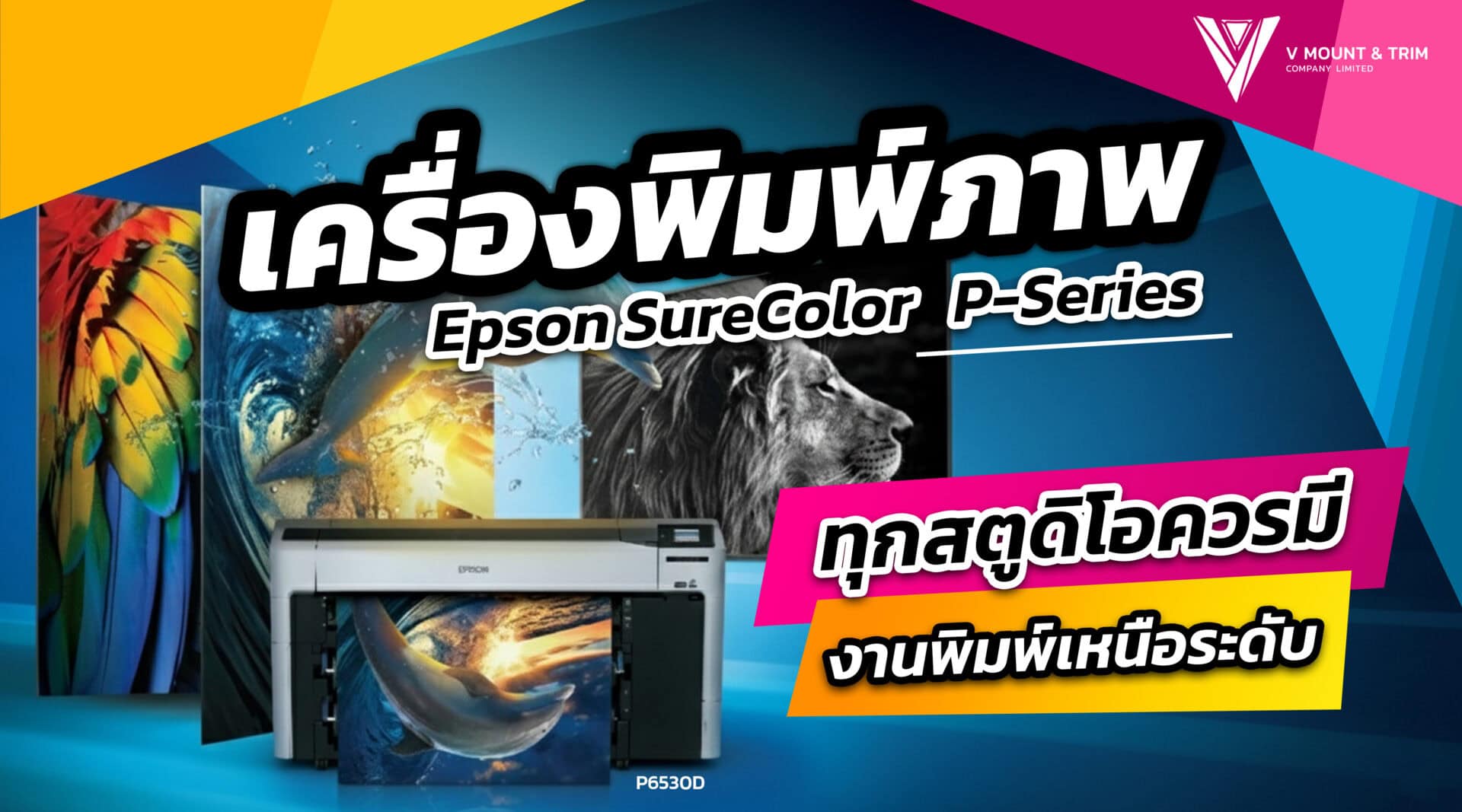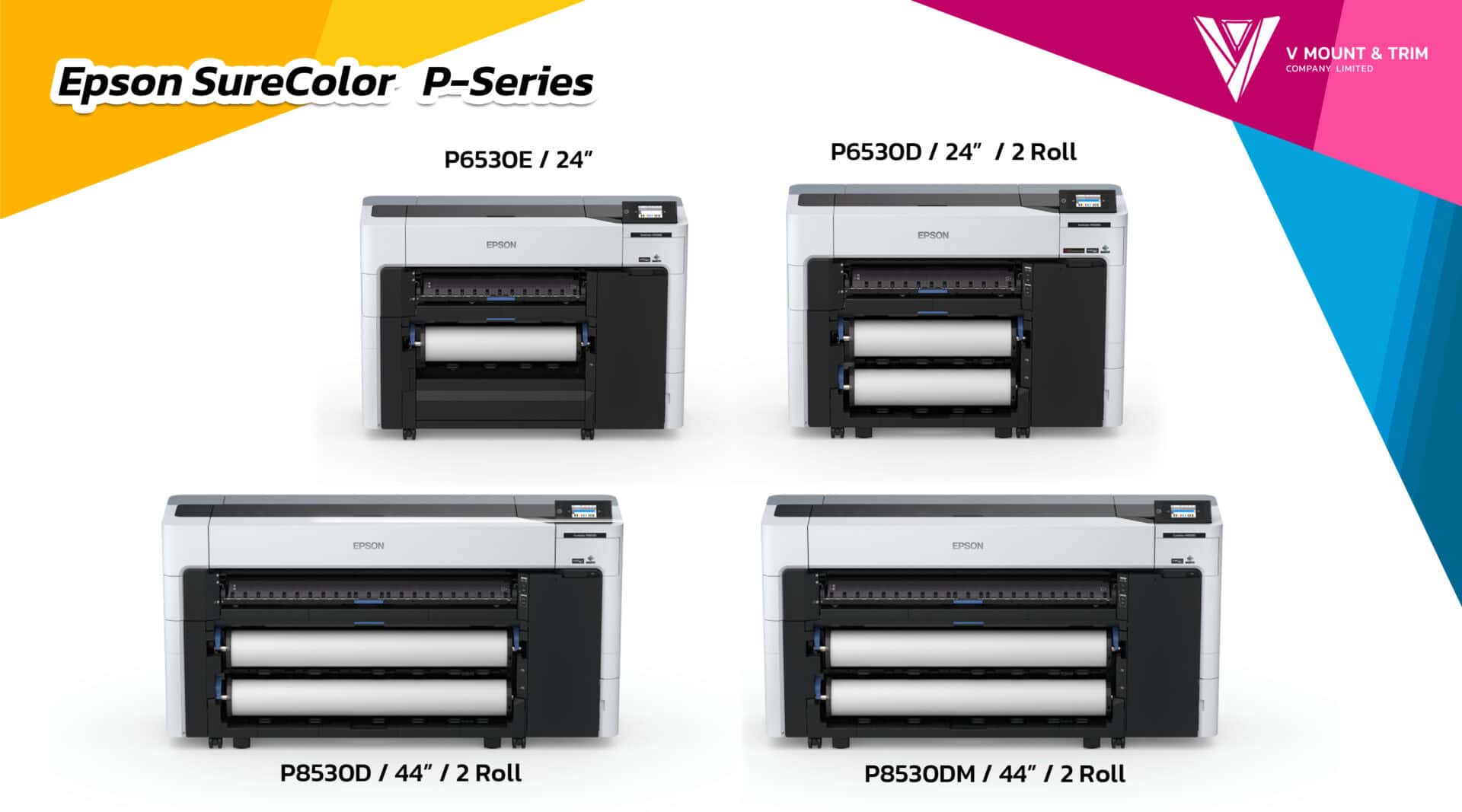 Epson SureColor P-Series เป็นเครื่องพิมพ์หน้ากว้าง ที่ออกแบบมาให้ตอบโจทย์สำหรับการใช้งานของ “มืออาชีพ” ตอบโจทย์การใช้งานของผู้ประกอบการที่หลากหลาย มีให้เลือกหลายรุ่นเพื่อให้ได้เครื่องพิมพ์ที่มีสเป็คตรงตามความต้องการมากที่สุด หากสนใจรายละเอียดเพิ่มเติม หรืออยากปรึกษาว่ารุ่นไหน เหมาะกับธุรกิจของคุณมากที่สุด ติดต่อเข้ามาสอบถามได้ที่ Line @vmountandtrim แล้วเราจะช่วยคุณเลือกเครื่องพิมพ์ภาพที่เหมาะสมกับคุณให้เอง !