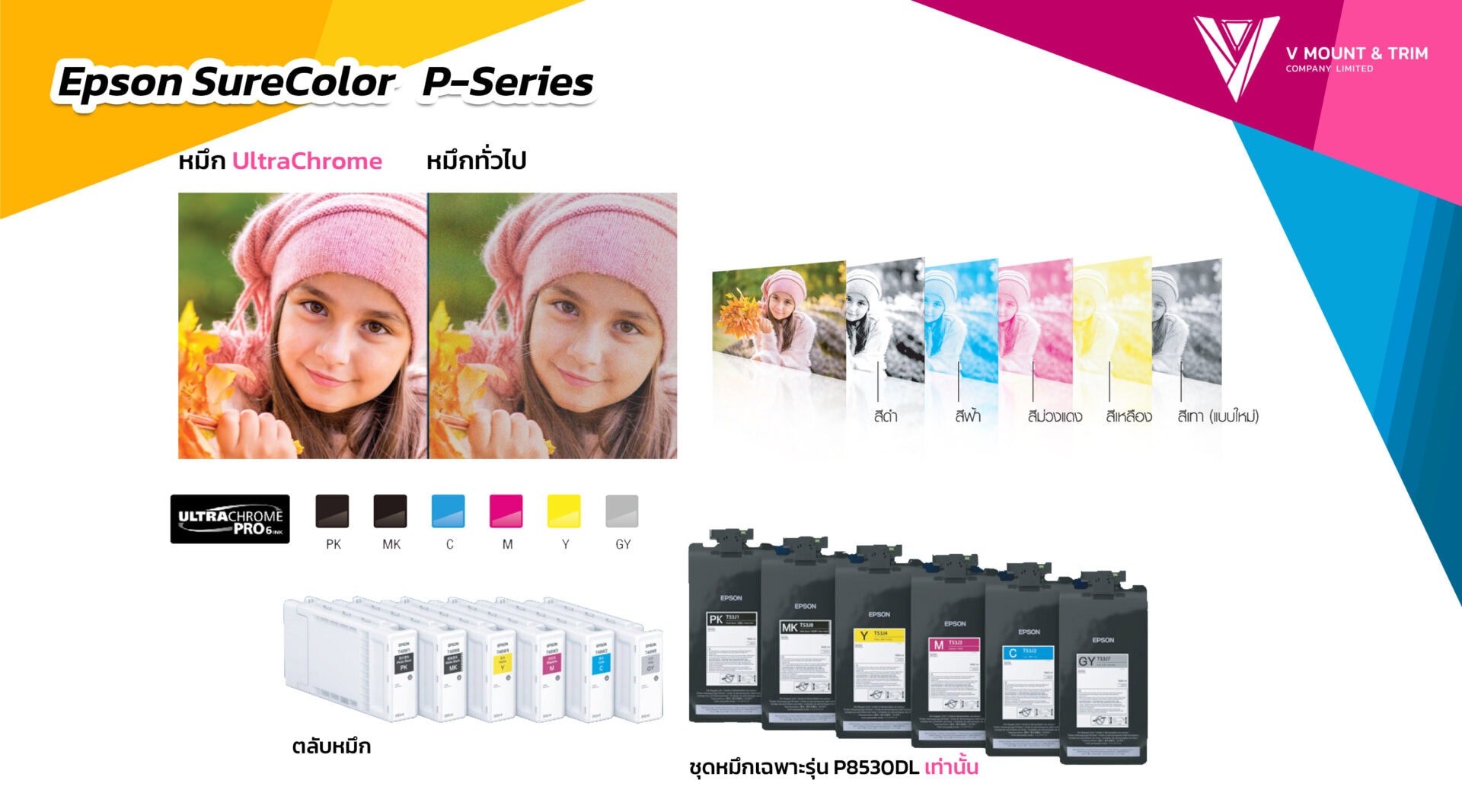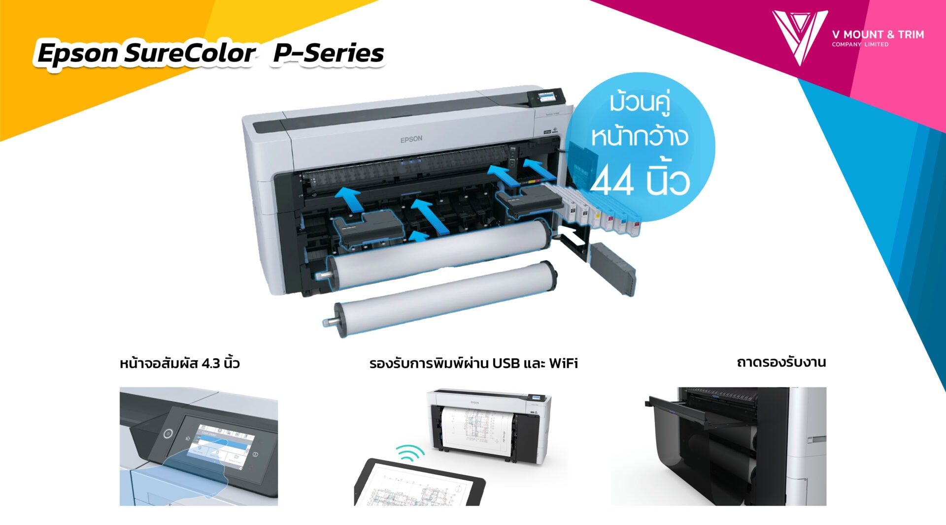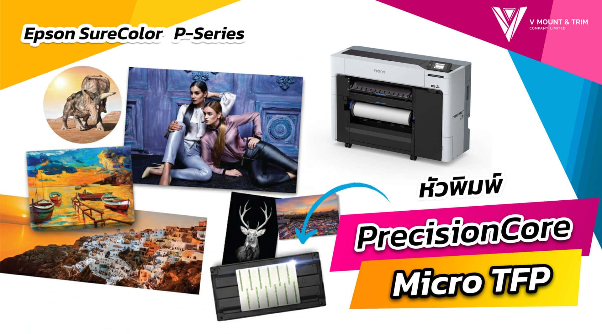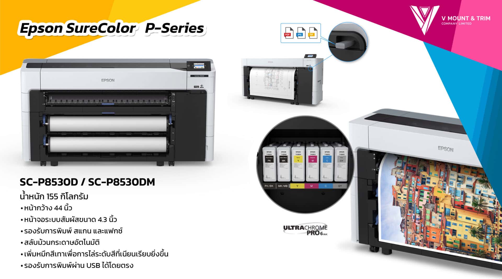 Epson SureColor P-Series เป็นเครื่องพิมพ์หน้ากว้าง ที่ออกแบบมาให้ตอบโจทย์สำหรับการใช้งานของ “มืออาชีพ” ตอบโจทย์การใช้งานของผู้ประกอบการที่หลากหลาย มีให้เลือกหลายรุ่นเพื่อให้ได้เครื่องพิมพ์ที่มีสเป็คตรงตามความต้องการมากที่สุด หากสนใจรายละเอียดเพิ่มเติม หรืออยากปรึกษาว่ารุ่นไหน เหมาะกับธุรกิจของคุณมากที่สุด ติดต่อเข้ามาสอบถามได้ที่ Line @vmountandtrim แล้วเราจะช่วยคุณเลือกเครื่องพิมพ์ภาพที่เหมาะสมกับคุณให้เอง !